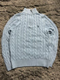 Dieser originale Vintage Ralph Lauren Pullover in Hellgrau besticht durch sein klassisches Zopfmuster und den sportlich-eleganten Half-Zip-Kragen. Ein ideales Piece für zeitlose Old-Money-Looks in erstklassiger Grade-A-Qualität.